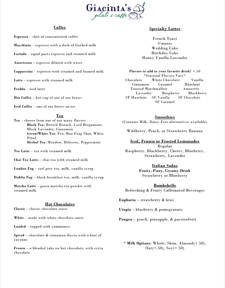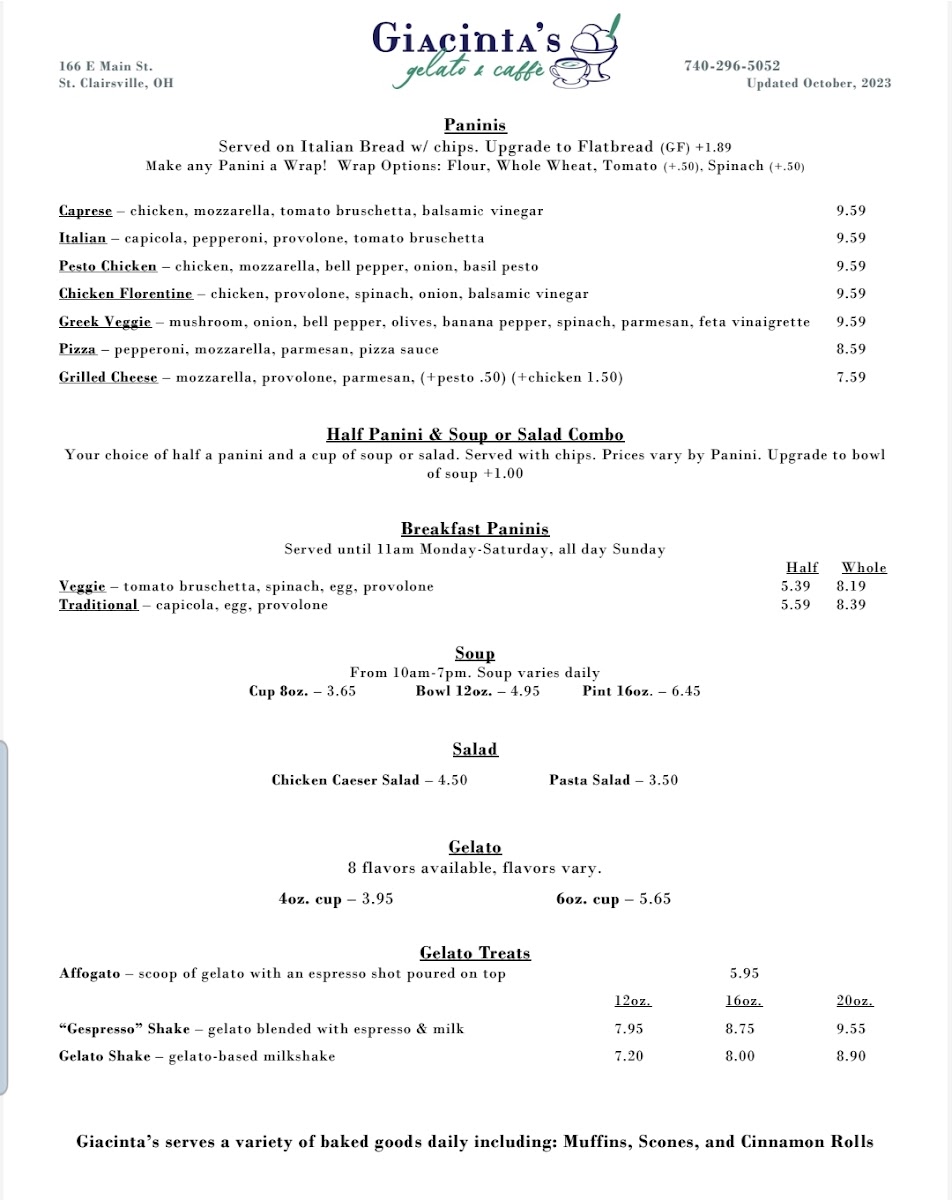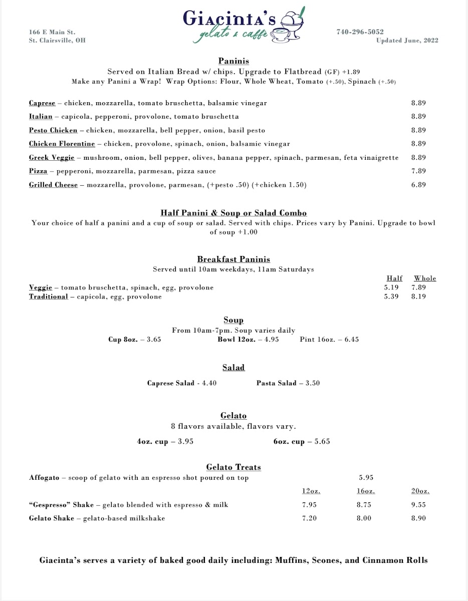 Giacinta's Gelato & Caffe offers a delightful menu that blends Italian-inspired flavors with comforting classics, making it a must-visit for anyone in the St. Clairsville area. Whether you're craving something sweet or savory, their menu has a range of options that cater to every taste.